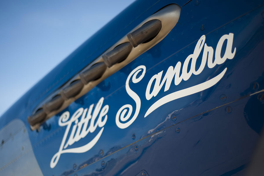 California Warbirds has maintained and operated N5460V since the late 1960's. Over the years, StrawBoss has worn different schemes but is currently painted as the mount flown by 328 Fighter Squadron/352nd FG, Col. James D Mayden. Mayden had 2 air victories, 4 ground kills and commanded the 352nd FG from July 1944 to September 1945. The right side "Little Sandra" is painted as the crew chief side, while the left wears "StrawBoss 2".